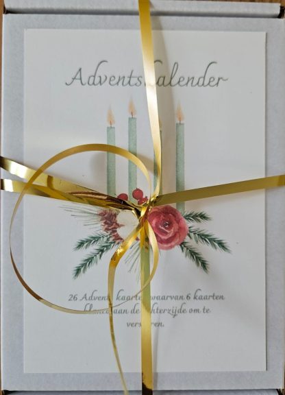 26 kaarten waarvan 20 met een tekst over Advent voorop en 6 blanco kaarten om als kerstkaart te versturen.